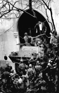 Marcelo Caetano e os ministros que com ele estavam no quartel são transportados, numa Chaimite, para o posto de comando do MFA, na Pontinha.